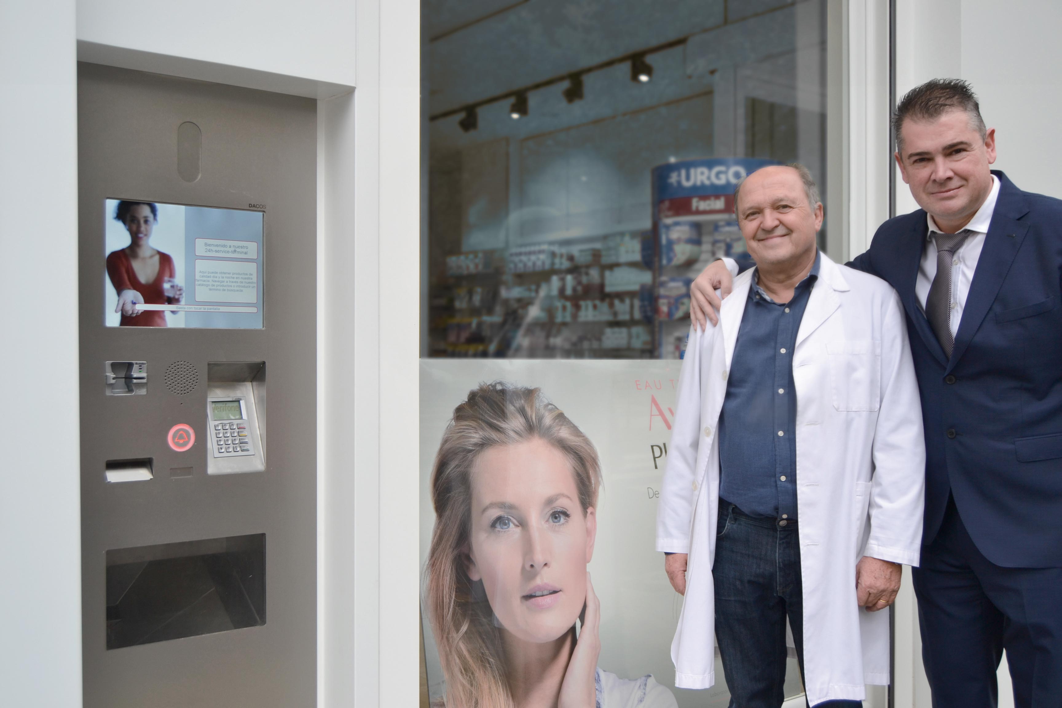 Foto: Heliodoro Collado, titular de la farmacia, y Juan Mirabet, de KLS Pharma Robotics